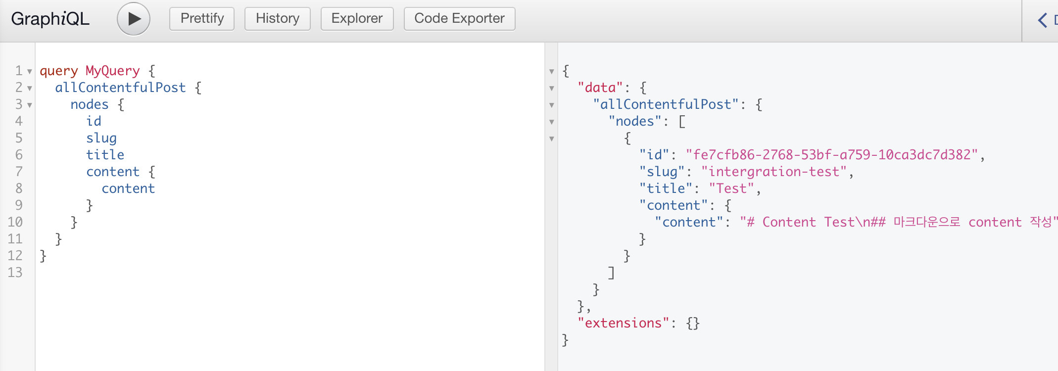 플러그인까지 정상적으로 저장을 했으면 Gatsby Graphql http://localhost:8000/___graphql 에서 다음과 같이 정상적으로 Contentful 데이터가 보입니다.