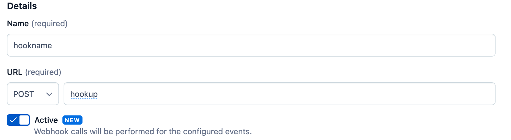 - 좀전에 생성한 webhook의 name, api를 입력하고 (post방식) active로 바꿔줍니다.