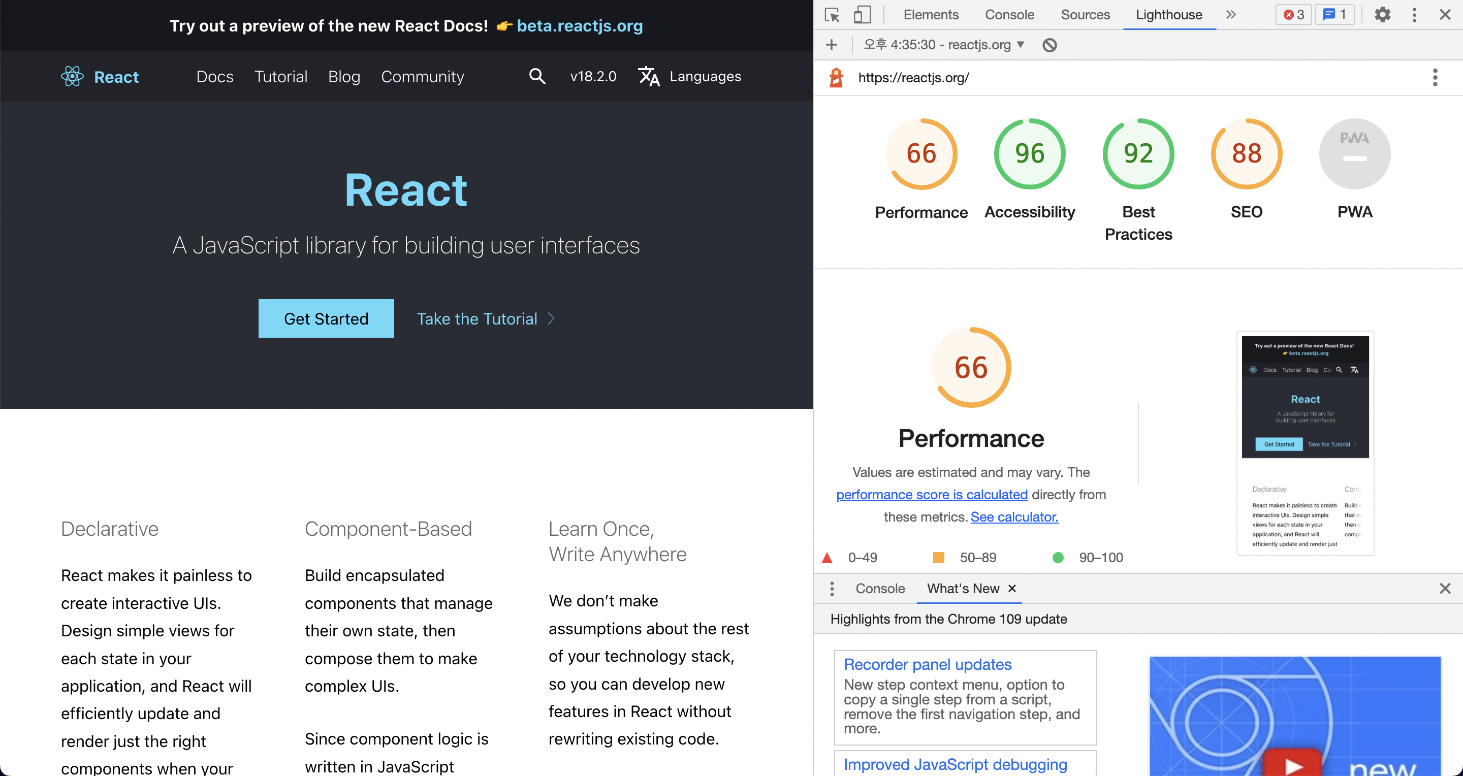React 공식 홈페이지에서 Lighthouse 리포트를 생성해봤습니다. 리포트를 살펴보면 크게 Performance, Accessibility, Best Practice, SEO 5개 카테고리로 분류하여 측정값을 보여주고 있습니다.