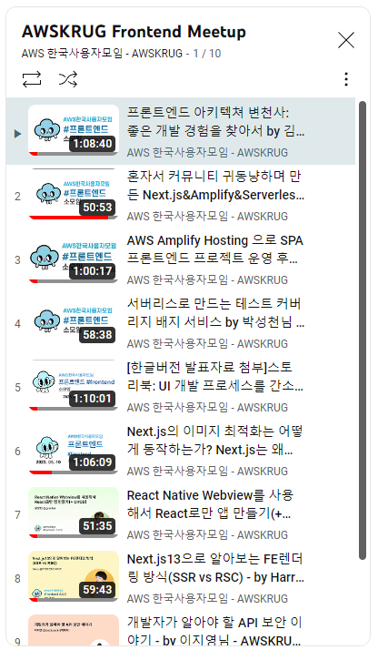 AWSKRUG 프론트엔드는 매달 한번씩 오프라인 모임을 진행한다. 매번 발표자료와 슬라이드를 유튜브와 깃허브를 통해 제공하는데 내용이 하나같이 알차고 도움이 되었다.