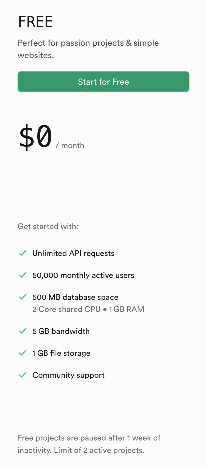지난 수년동안 Firebase의 대체제를 표방하는 많은 프로젝트들이 등장했지만 모두 소리소문 없이 사라졌다. 그 와중에 Supabase는 매우 독보적이다. React, Vue.js, Flutter 등 대부분의 플랫폼에서 사용가능하도록 SDK를 제공하고 개발친화적인 가이드 문서를 통해 손쉽게 Supabse를 사용할 수 있다. 무엇보다 API 제공횟수가 무제한이란 점은 Supabse의 압도적인 장점이다.
