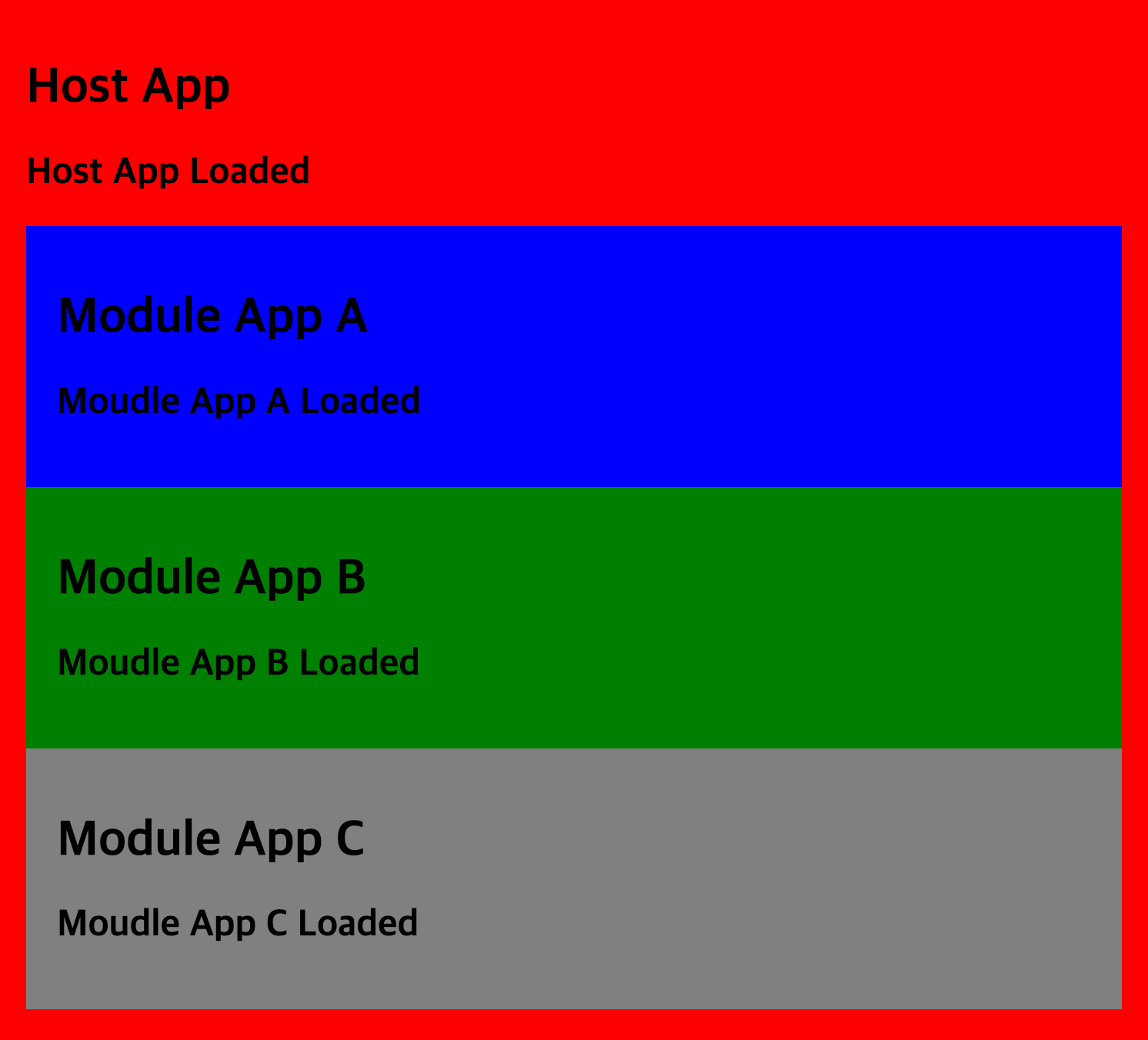 localhost 3000에서 4000, 4001, 4002의 A,B,C의 앱을 불러오는것을 확인할 수 있다. 예시 코드는 아래 저장소에 있으니 설치 후 확인해볼 수 있다. 설정이 복잡할뿐이지 코드 자체가 어렵진 않아서 금방 개념을 이해할 수 있을것이다.
