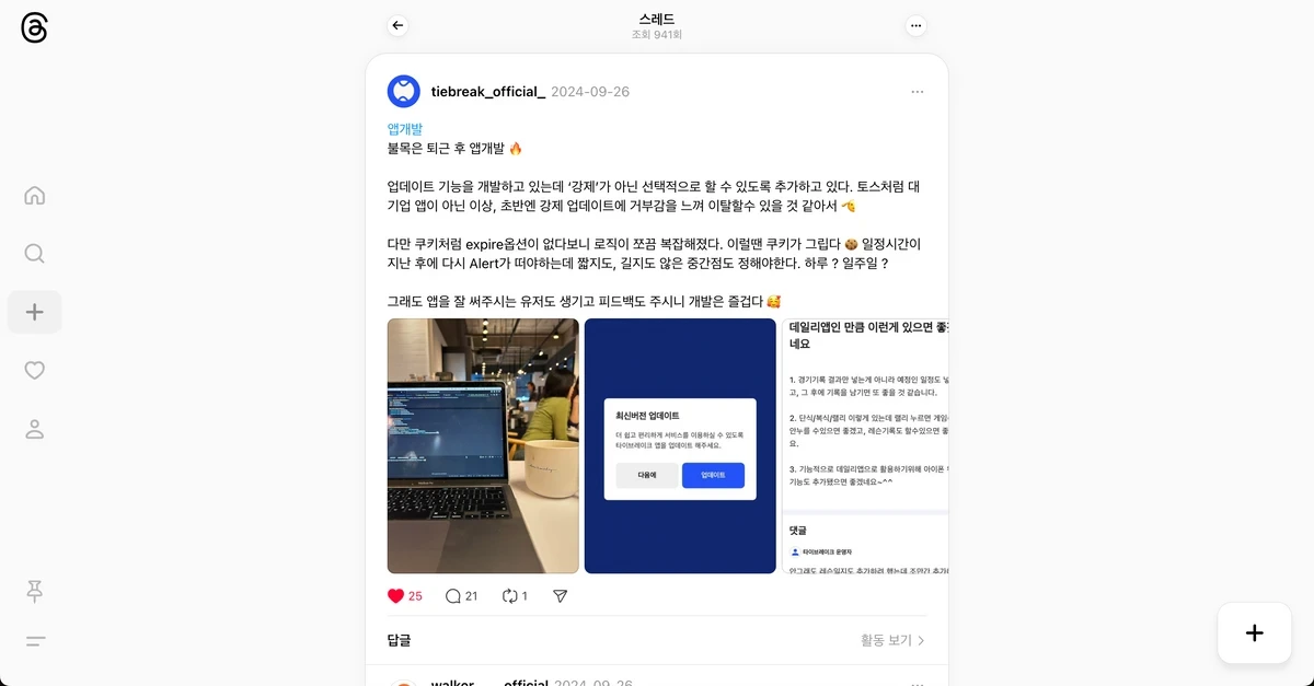 프로덕트 초기부터 돈을 들여 광고를 돌릴 필요는 없다 생각했고, 최소한의 비용으로 프로덕트를 자주 노출하기 위해 스레드와 인스타그램을 활용했습니다. 마침 테니스 인구 풀이 넓은 스레드에는 매번 개발할 때마다 메이커 로그를 올렸고 인스타그램은 업데이트와 앱 활용 방법 등을 노출했습니다.