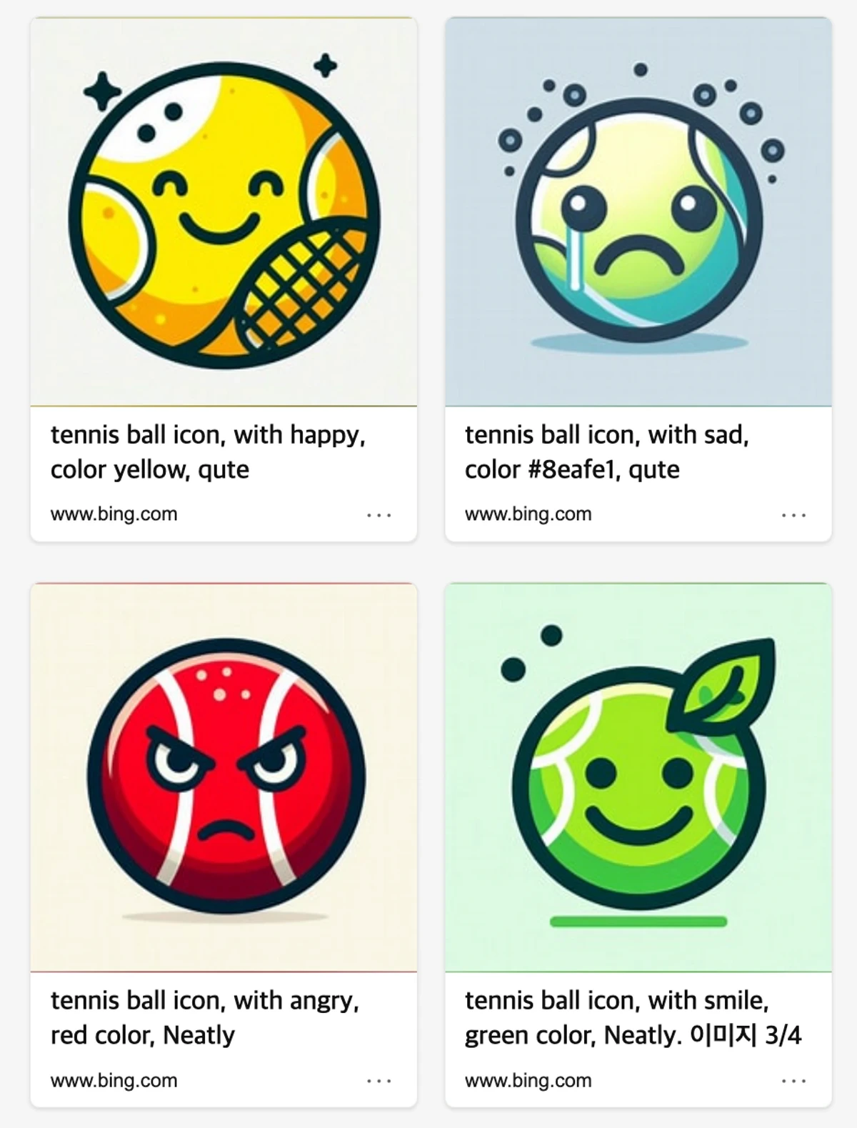 대AI의 시대에 걸맞게 아이콘 생성 시 인공지능의 도움을 받았습니다. 표정이 들어간 테니스 공 모양의 아이콘이 필요했는데 Bing AI를 통해 원하는 아이콘을 생성할 수 있었습니다.
