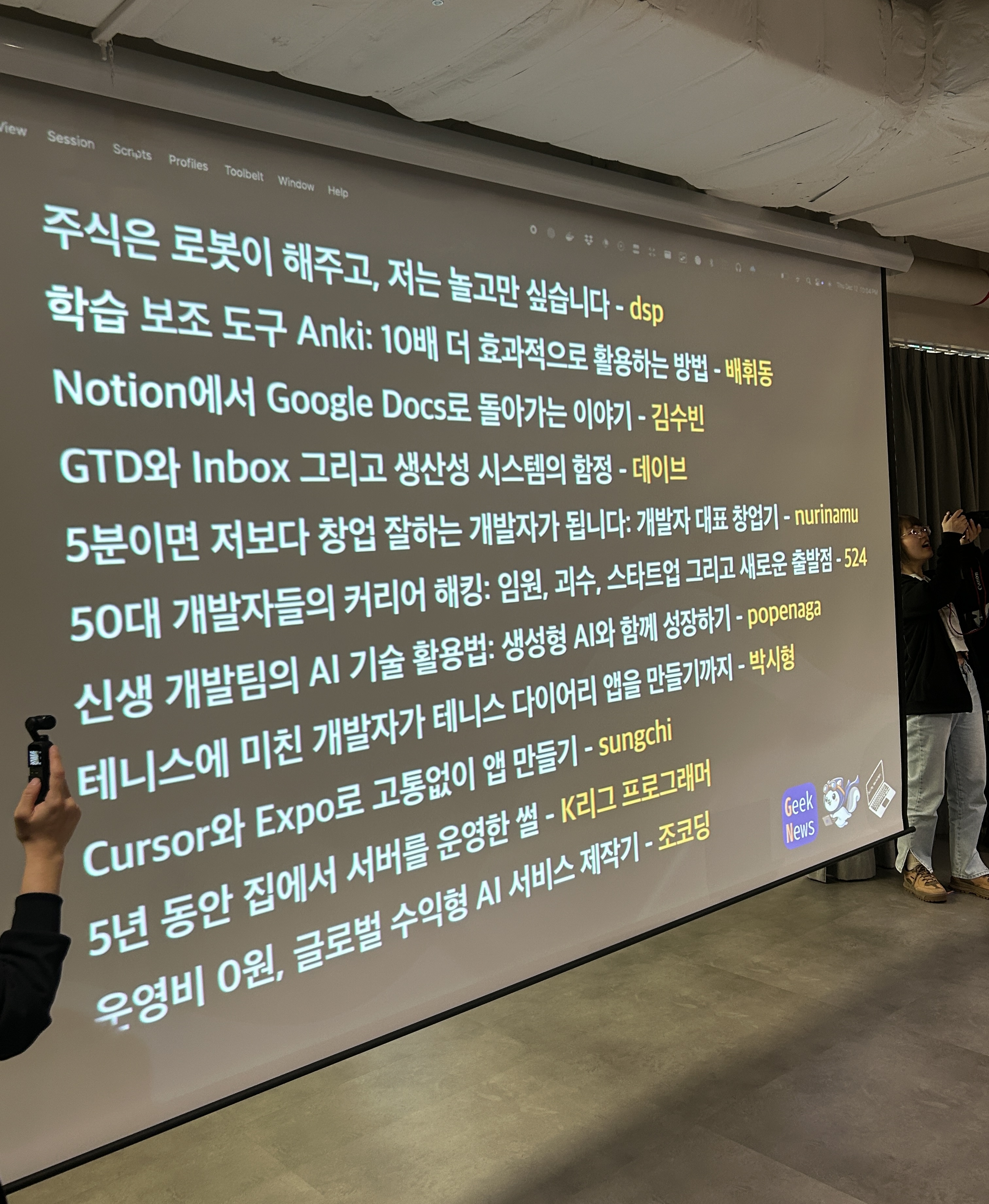 Geek News의 이야기가 끝나고 본격적으로 라이트닝 토크를 시작했습니다. 50대 개발자의 이야기부터 창업, 자동화, 사이드 프로젝트 등 주제가 다양했는데 아무래도 대 생성형 AI의 시대이다 보니 이 부분이 가장 인기가 많았네요.