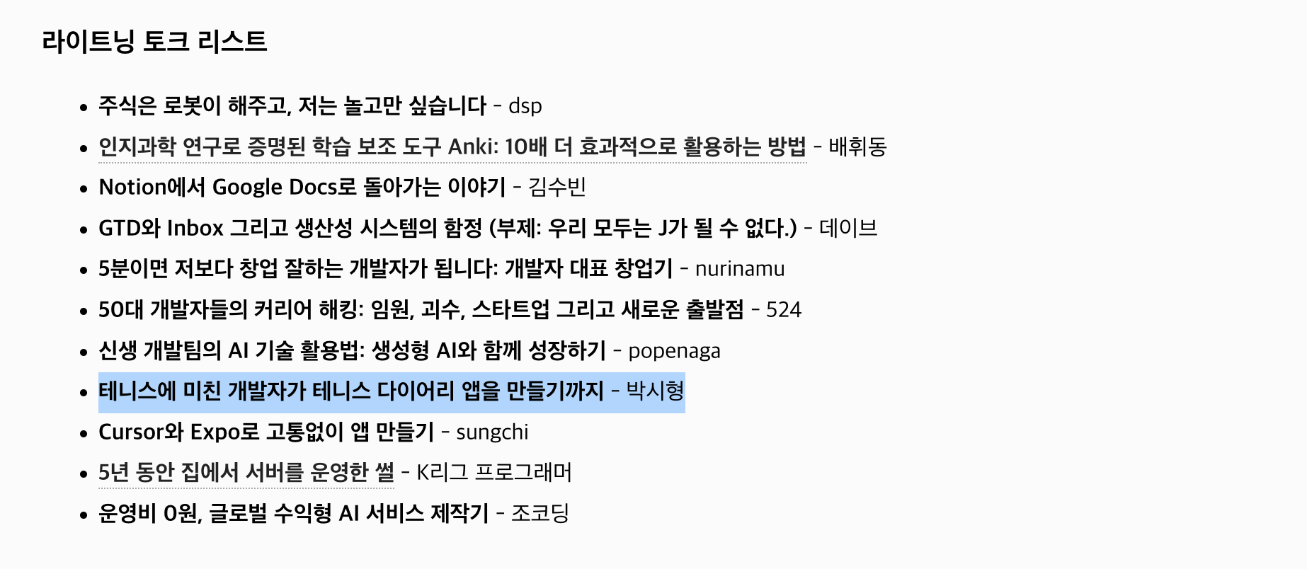 라이트닝 토크 발표자 선정이 되고 토크 리스트를 살펴보니, 평소 링크드인과 커뮤니티를 통해 접하던 유명한 분들도 계셨습니다. 이쯤되니 슬슬 발표하는게 실감이 나기도 했고, 발표 내용을 어느정도 간추려야겠다고 생각했습니다.