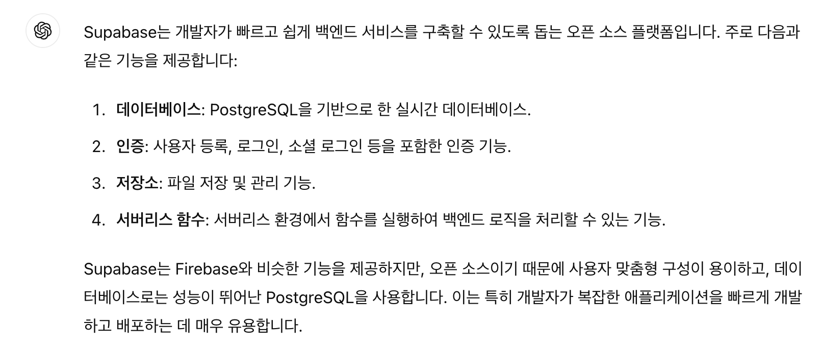 Supabase에 대해 생소할 수도 있으니 GPT에게 물어보니 다음과 같이 답변을 해주네요.